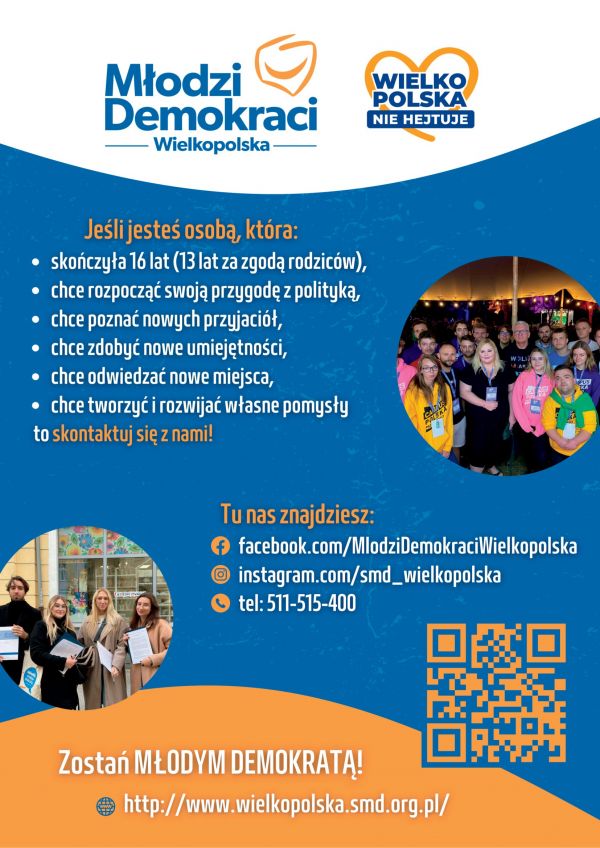 Stowarzyszenie Młodzi Demokraci – Wielkopolska, zaprasza do współpracy, zachęca do wstąpienia, mobilizuje do aktywności Skontaktuj się poprzez: www.wielkopolska.smd.org.pl lub tel.: +48 511 515 400
