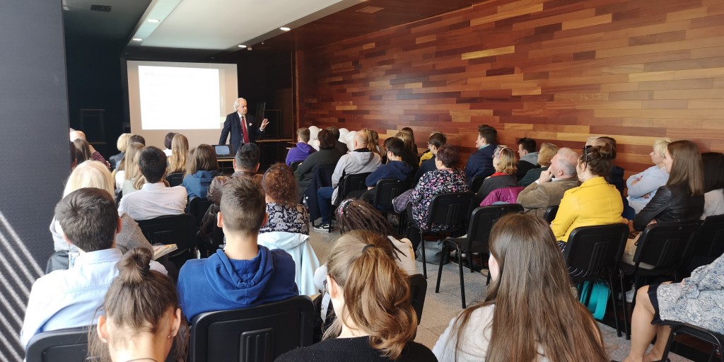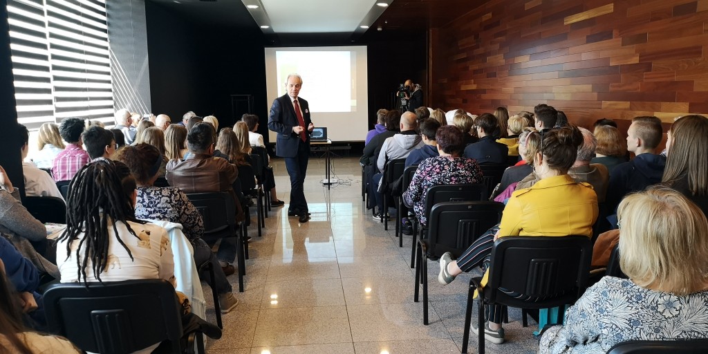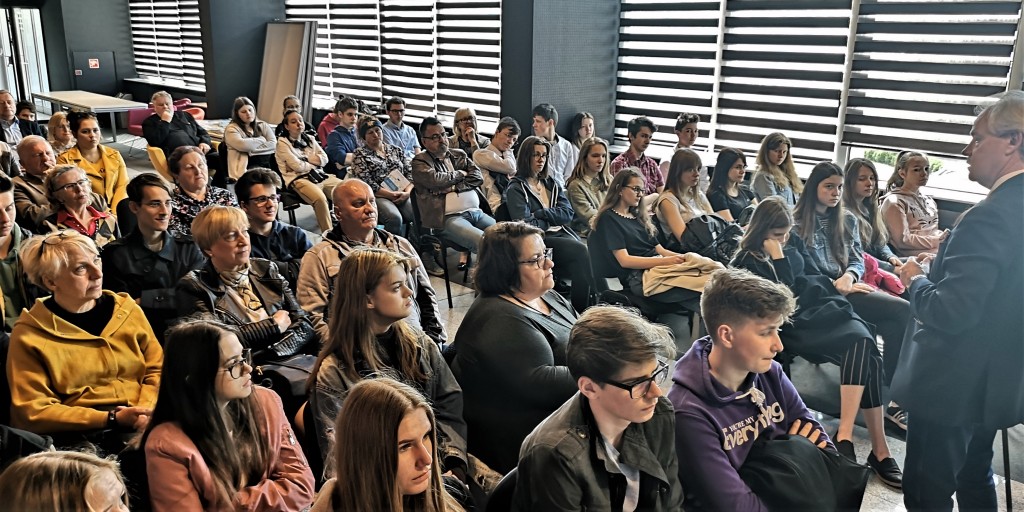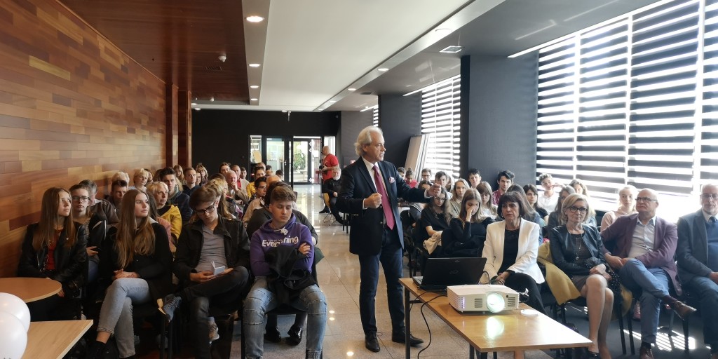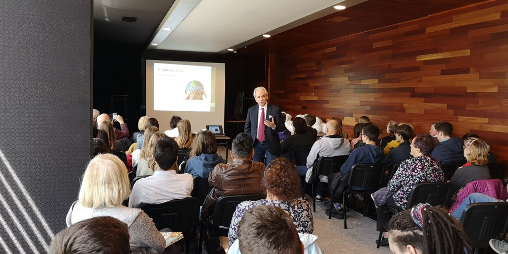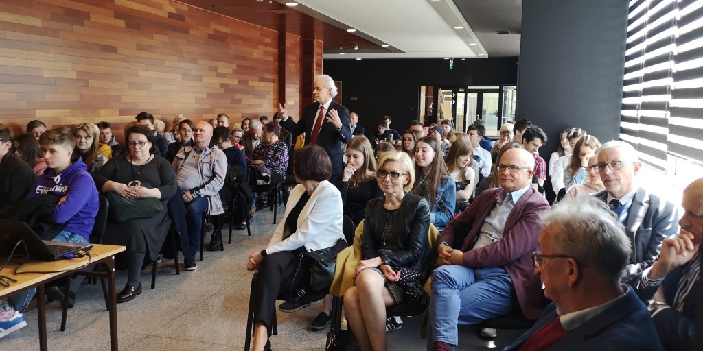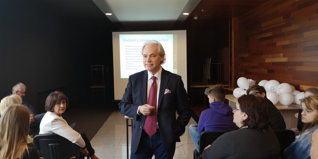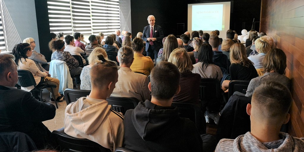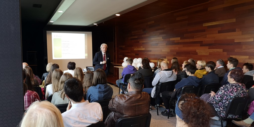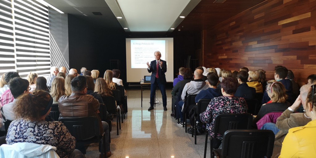 W tym roku w Polsce obchodzimy trzy ważne rocznice: 15 lat członkostwa naszego kraju w Unii Europejskiej, 20 lat w strukturach NATO oraz 30 lat polskich przemian ustrojowo-gospodarczych. To znamienne, że te 3. jubileusze przypadają tuż po najważniejszej rocznicy, którą czciliśmy niedawno, a więc stu lat od odzyskania przez Polskę niepodległości. To kamienie milowe naszej drogi ku wolności. Warto więc przy tej okazji podsumować te okresy i zobaczyć jak bardzo w tym czasie rozwinął się nasz kraj – rozpoczął swój wykład Adam Szejnfeld, europoseł z Wielkopolski, który zaczynając swoje wystąpienie w formie multimedialnej przedstawił w skrócie drogę Polski do Wspólnoty Europejskiej.