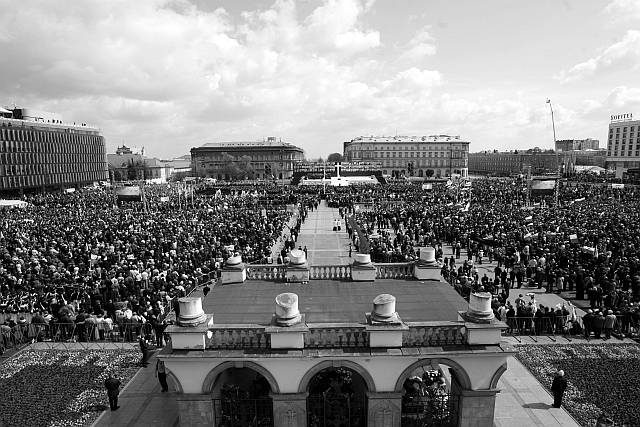 „Stoimy tu, w tym miejscu uświęconym historią Warszawy, aby pożegnać wszystkich, którzy zginęli koło Smoleńska, z drżeniem serca odczytujemy każde z 96 imion i nazwisk, wpatrujemy się we wszystkie z 96 fotografii. Z drżeniem wspominamy słowa Jana Pawła II, który tu modlił się o odnowienie naszej ziemi. Pamiętamy, że ta modlitwa została wysłuchana, wolna Polska zrodziła się z naszej wiary, nadziei i solidarności. Niewiele jest takich chwil w dziejach narodu, gdy jesteśmy wszyscy razem. Katastrofa właśnie do takich należała”, dodał marszałek. A przecież „świat runął nam po raz drugi w tym samym miejscu świata. Polacy, ludzie różnego wieku i różnych przekonań spontanicznie zbierali się na pl. Piłsudskiego, przed Pałacem Prezydenckim, na ulicach Warszawy i innych miast Polski, by oddać hołd ofiarom tragicznej katastrofy. Niewypowiedziany ból i rozpacz. W tym czasie wszyscy czuliśmy tak samo i to samo. Świat czuł z nami”.