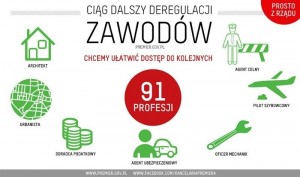 We wrześniu 2012 r. rząd przyjął pierwszy pakiet deregulacyjny, który ma ułatwić wykonywanie 50 zawodów, w tym głównie prawniczych, a także z zakresu pośrednictwa pracy, sportu i rekreacji, ochrony fizycznej, żeglugi oraz nauki jazdy i przewozu osób. Obecny projekt kontynuuje realizację zapowiedzi z listopadowego exposé premiera o podjęciu działań skutkujących zmniejszeniem liczby zawodów regulowanych w Polsce. W Ministerstwie Sprawiedliwości trwają prace nad tzw. trzecim pakietem deregulacyjnym. Wszystkie trzy transze powinny uwolnić 100 tys. nowych miejsc pracy. Deregulacja przez ograniczenie lub likwidację obecnych wymogów (np. certyfikatów, licencji) ułatwi wejście do danego zawodu.