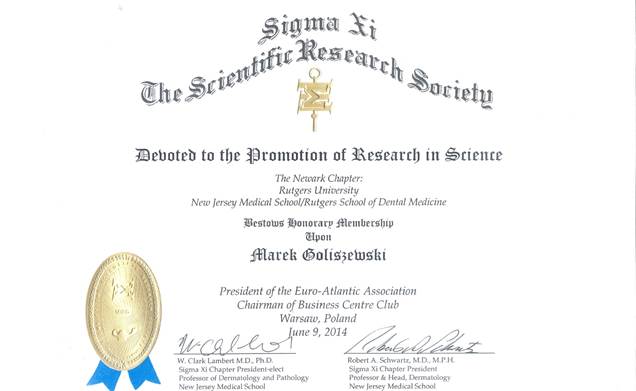 Marek Goliszewski prezes Business Centre Club i Stowarzyszenia Euro-Atlantyckiego odebrał Honoris Causa Towarzystwa Badań Naukowych Sigma Xi z rąk prezydenta – profesora Roberta A. Schwartza MD, MPH, DSc (Hon).