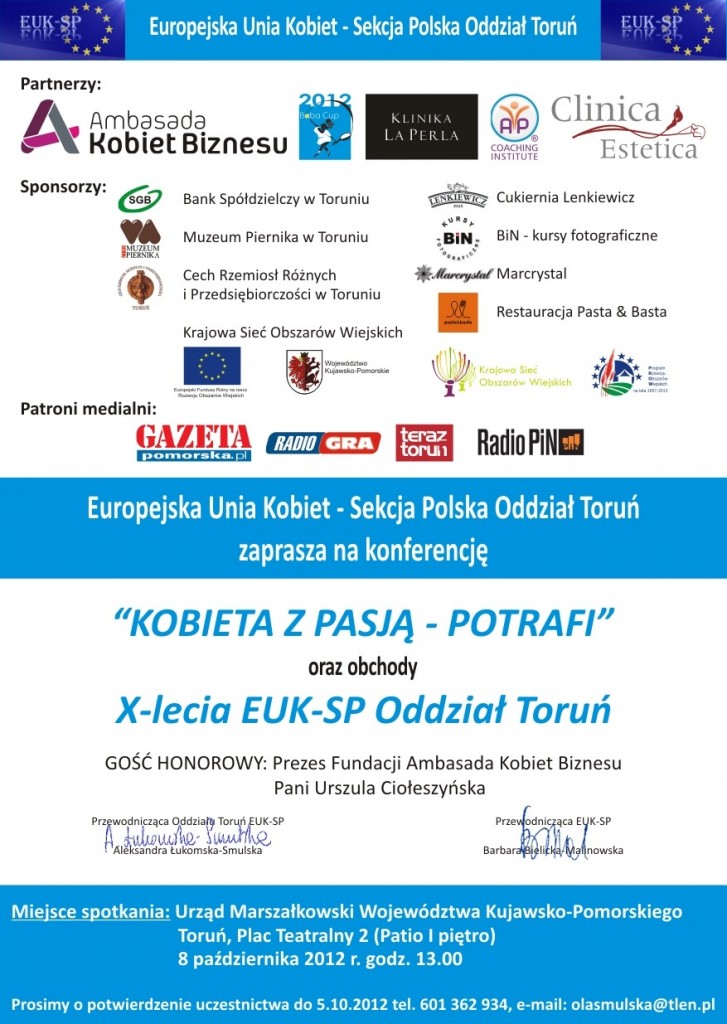 Czołowe miejsce w działalności Sekcji Polskiej EUK zajmuje Oddział Toruński, który  liczy sobie ponad 10 lat. Jego przewodniczącą jest Aleksandra Łukomska-Smulska. Oddział działa  na rzecz szeroko pojętego środowiska kobiecego i budowy państwa obywatelskiego na szczeblu lokalnym, współdziała z władzami województwa i miasta Torunia. Współpracuje z innymi organizacjami pozarządowymi na rzecz ich środowiska, m.in. w ramach Rady Pożytku Publicznego (Aleksandra Łukomska Smulska jest jej  wiceprzewodniczącą),  wieloma organizacjami kobiecymi, wspierając je w realizacji działań statutowych, np. z Baba Cup  przy organizacji amatorskiego turnieju deblowego tenisa ziemnego kobiet i Fundacją Ambasada Kobiet Biznesu. Wspiera inicjatywy swoich  członkiń, jak np. Festiwal Piosenki Angielskiej, organizowany przez dyrektor Krystynę Karpińską. Oddział również zorganizował  konferencje przeznaczone dla kobiet promujące książkę „Kobiety Niezapomniane” w 2010 r., a w 2011 r. konferencję o zasięgu ogólnopolskim „Kobieta Potrafi”. W tym roku odbędą się obchody  X-lecia istnienia  Oddziału, które zostaną połączone z konferencją „Kobieta z Pasją Potrafi”. Zorganizowane zostaną pod honorowym patronatem Przewodniczącego Sejmowej Komisji Skarbu Państwa – Adama Szejnfelda, Wojewody Kujawsko-Pomorskiego  Ewy Mes, Marszałka Województwa Kujawsko-Pomorskiego Piotra Całbeckiego i  Prezydenta Torunia  Michała Zaleskiego.  Patronat medialny objęły: „Gazeta Pomorska”, „Radio Gra”, „Teraz Toruń” i „Radio PIN”.  Partnerami w tym przedsięwzięciu będą: Fundacja Krakowska Ambasada Kobiet Biznesu, Baba Cup 2012,  Klinika La Perla Coatching Institute i Clinica Estetica. Sponsorami przedsięwzięcia będą: Bank Spółdzielczy w Toruniu, Cukiernia Lenkiewicz, Restauracja Pasta & Basta, Marcrystal, Krajowa Sieć Obszarów Wiejskich, Cech Rzemiosł Różnych w Toruniu, Muzeum Piernika oraz  fotograf Paweł Biarda. Gościem specjalnym obchodów będzie Urszula Ciołeszyńska – Prezes Fundacji Ambasada Kobiet Biznesu i twórczyni sieci Ambasadorów Przedsiębiorczości Kobiet w Polsce.  X-lecie jest odpowiednim momentem wyróżnienia kobiet z Polski, Regionu Kujawsko-Pomorskiego i miasta Torunia tytułem „Kobiety z Pasją”. Jest też właściwą okazją do złożenia mężczyznom podziękowań za wspieranie przez nich  działań na rzecz promocji  kobiet.
